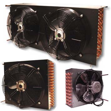 Condensadores con Forzador de 1/3HP a 20HP., Cabezales y Bafle en chapa galvanizada. Tuercas remachadas en Bafle para reja soporte forzador/es. Caños de cobre Ø3/8" expandidos mecanicamente. Diseño de aletas de aluminio para alto rendimiento
