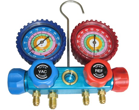 Manifold (4 válvulas) deAluminio R12/R22/R502 con 4 mangueras de 36'' 500-2500PSI con VISOR.